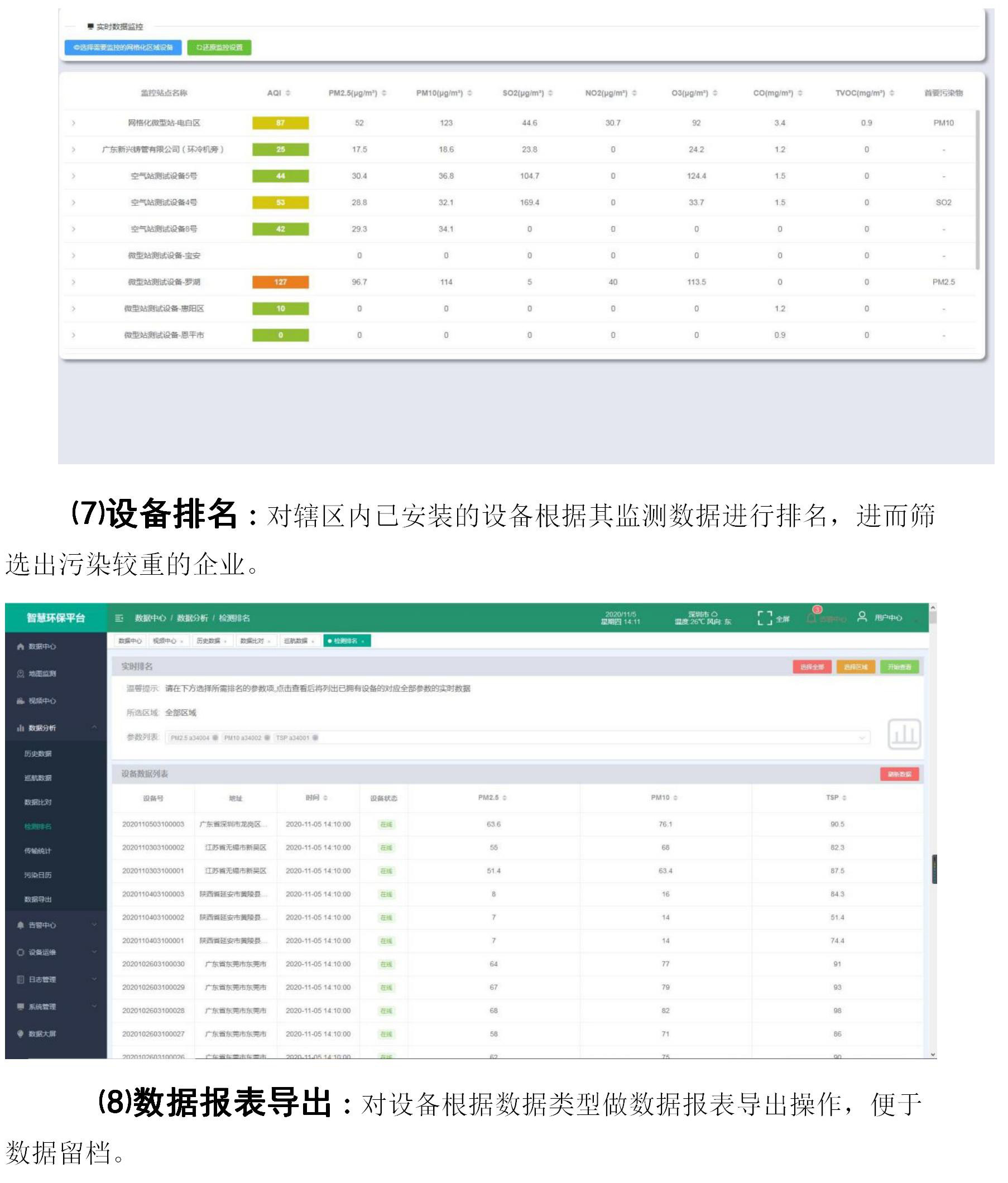 ⑺設(shè)備排名:對(duì)轄區(qū)內(nèi)已安裝的設(shè)備根據(jù)其監(jiān)測(cè)數(shù)據(jù)進(jìn)行排名,進(jìn)而篩選出污染較重的企業(yè)。