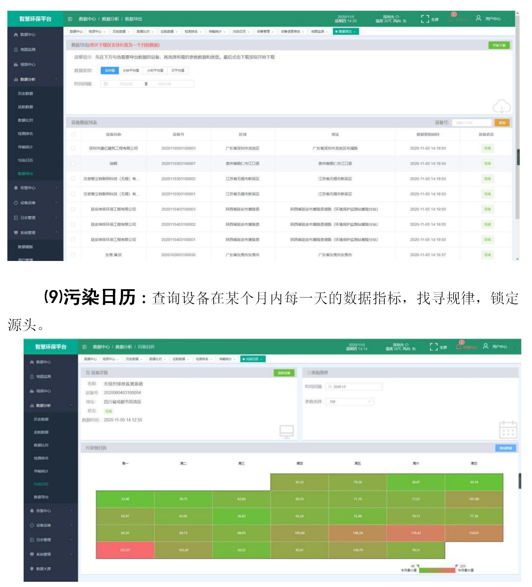 ⑼污染日歷:查詢?cè)O(shè)備在某個(gè)月內(nèi)每一天的數(shù)據(jù)指標(biāo),找尋規(guī)律,鎖定源頭。