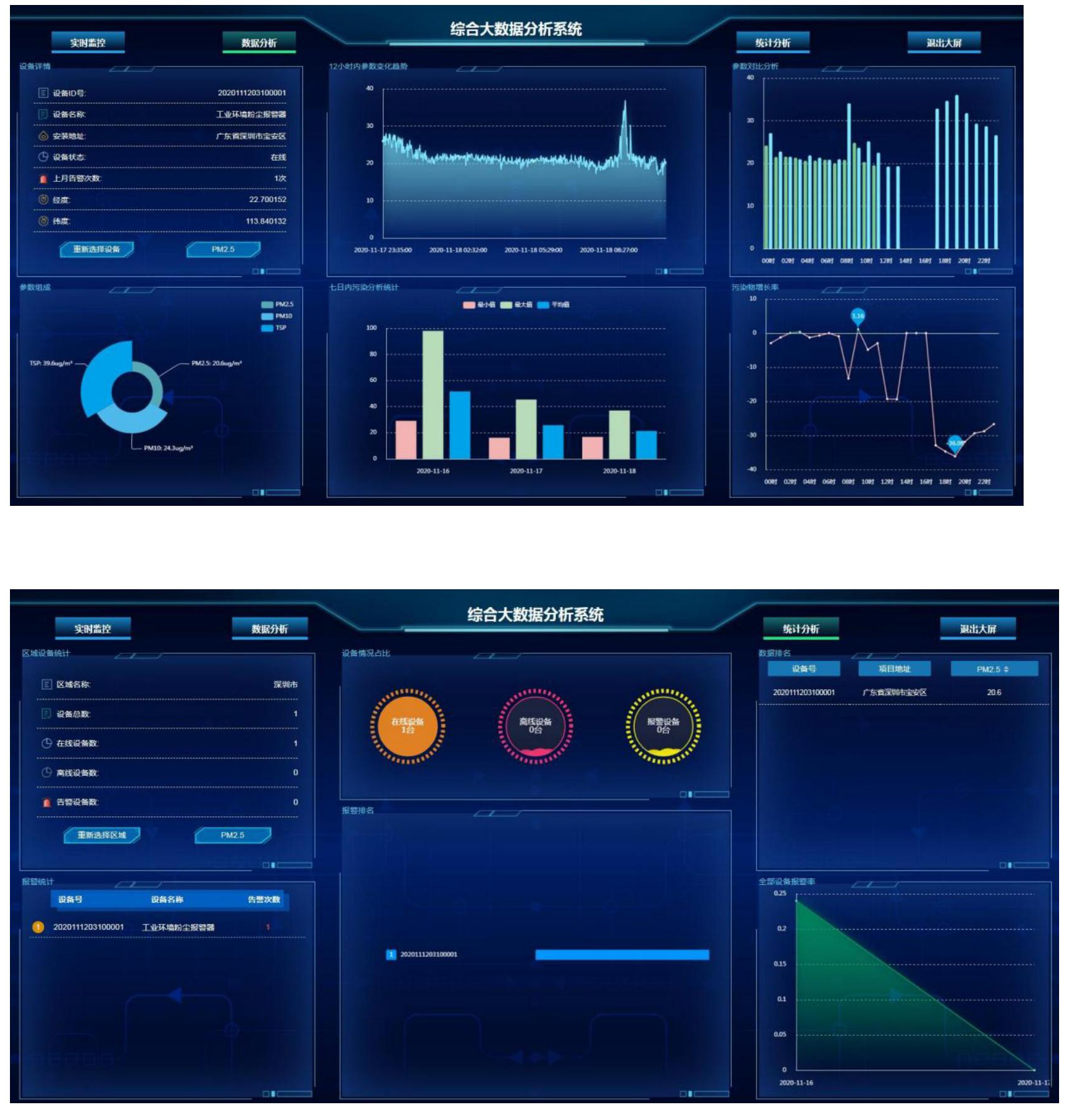 ⑿數(shù)據(jù)監(jiān)管駕駛艙:大數(shù)據(jù)監(jiān)管大屏,便于環(huán)保監(jiān)管人員統(tǒng)籌監(jiān)管,實(shí)時(shí)掌控轄區(qū)內(nèi)各個(gè)企業(yè)監(jiān)測(cè)點(diǎn)位的污染排放動(dòng)態(tài),超限排放及時(shí)處理,設(shè)備狀態(tài)異常及時(shí)反饋上報(bào),快速解決,有效監(jiān)管
